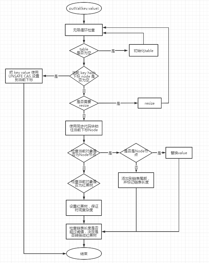 | final V putVal(K key, V value, boolean onlyIfAbsent) { if (key == null || value == null) throw new NullPointerException(); int hash = spread(key.hashCode()); int binCount = 0; for (Node<K,V>[] tab = table;;) { Node<K,V> f; int n, i, fh; if (tab == null || (n = tab.length) == 0) tab = initTable(); else if ((f = tabAt(tab, i = (n - 1) & hash)) == null) { if (casTabAt(tab, i, null, new Node<K,V>(hash, key, value, null))) break; } else if ((fh = f.hash) == MOVED) tab = helpTransfer(tab, f); else { V oldVal = null; synchronized (f) { if (tabAt(tab, i) == f) { if (fh >= 0) { binCount = 1; for (Node<K,V> e = f;; ++binCount) { K ek; if (e.hash == hash && ((ek = e.key) == key || (ek != && key.equals(ek)))) { oldVal = e.val; if (!onlyIfAbsent) e.val = value; break; } Node<K,V> pred = e; if ((e = e.next) == null) { pred.next = new Node<K,V>(hash, key, value, null); break; } } } else if (f instanceof TreeBin) { Node<K,V> p; binCount = 2; if ((p = ((TreeBin<K,V>)f).putTreeVal(hash, key, value)) != null) { oldVal = p.val; if (!onlyIfAbsent) p.val = value; } } } } if (binCount != 0) { if (binCount >= TREEIFY_THRESHOLD) treeifyBin(tab, i); if (oldVal != null) return oldVal; break; } } } addCount(1L, binCount); return null; }